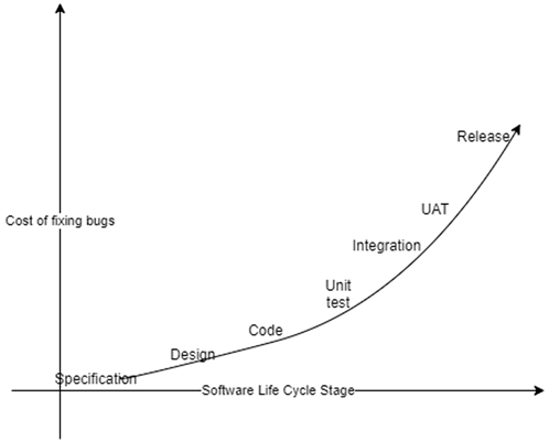 SW 테스트의 진언 중 하나는 SW 개발 수명주기에서 조기에 테스트하고 자주 테스트하라는 것이다. 요구사항 수집, 사양 작성, 코딩, 테스트 및 릴리스에서 요구사항의 변화에 따라 버그 수정 비용이 기하급수적으로 증가하기 때문이다. 버그가 사용자에게 릴리스 되고 나면, 디버깅, 근본 원인 및 수정이 매우 어려워지고 비용 또한 많이 든다. 더 중요한 것은 사용자의 신뢰를 잃게 되어 이를 다시 되돌리는 것이 매우 어렵다는 점이다.