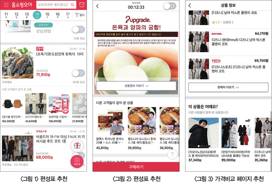 세 번째는 가격비교 페이지 하단 추천(<그림 3>)이다. 홈쇼핑모아에서는 동일한 상품들을 가격비교페이지로 묶어서 보여주고 있다. 이 페이지에 들어가면 페이지 하단에 방금 누른 상품과 연관된 상품들을 추천해준다.