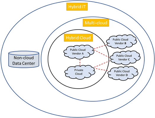 하이브리드 IT 환경에는 멀티 클라우드(여러 클라우드 공급업체의 서비스), 하이브리드 클라우드(퍼블릭 및 프라이빗 클라우드), 비-클라우드 구성 요소 외에도 이들의 조합을 통한 하이브리드 운영 모델이 포함될 수 있다(표1). 실제로 대부분의 기업들은 이미 하나 이상의 클라우드 제공업체를 사용하고 있다. (참고: 2018년 가트너 클라우드 채택 및 사용 연구, 「멀티클라우드 및 인터클라우드 데이터 관리에 대한 준비가 되셨습니까?」)