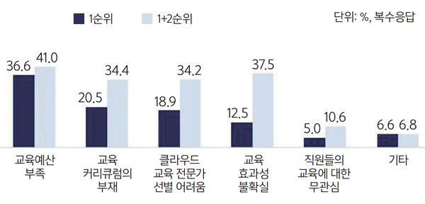 클라우드 컴퓨팅 전문 교육을 할 수 있는 강사에 대한 처우 개선도 시급하다. 업계 관계자는 “현재 정부의 강사 비용에 대한 책정 기준에 따르면 초등학생에게 코딩을 가르치는 강사와 클라우드 전문 컨설팅을 가르치는 강사가 같은 비용을 받고 있다. 시간에 따라 강사비가 책정되는 현재 구조에서는 클라우드 관련 좋은 강사를 확보하기 쉽지 않다. 세상에 어떤 전문가가 본인의 가치를 제대로 인정받지 못하면서 강의를 하겠느냐”고 말했다.
