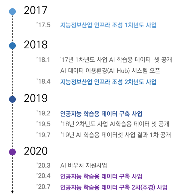 ‘AI 학습용 데이터 구축사업’은 디지털 뉴딜 정책의 핵심 과제 중 하나인 ‘데이터댐 구축’에서 가장 많은 주목을 받고 있는 사업이다. 국내 AI 생태계를 활성화시키기 위해, 정부 예산을 통해 상대적으로 미흡한 학습용 데이터 구축을 지원하겠다는 목표다.