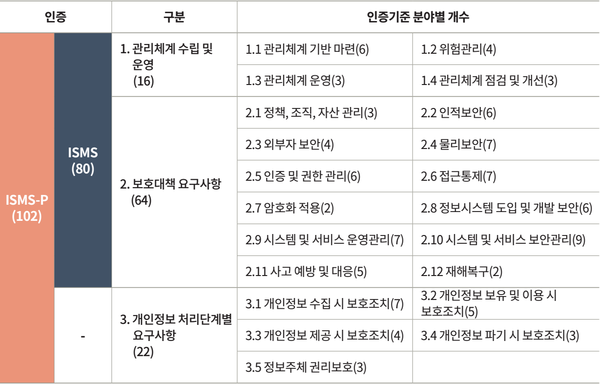 ‘정보보호 관리체계 인증(ISMS) 제도’는 주요 정보자산 유출을 사전에 예방하기 위해 조직이 스스로 운영 중인 정보보호 및 개인정보보호 시스템이 적합한지 인증하는 제도다. 정보보호 관리체계 수립 및 운영, 정보보호대책 요구사항, 개인정보 처리단계별 요구사항 등 3개 분야 102개 항목을 심사해 인증을 발급한다. 일반 기업 및 기관을 대상으로는 325개의 점검항목, 금융기업을 대상으로는 385개의 점검항목을 통해 인증 심사를 진행하게 된다. 인증은 서비스 운영을 위한 조직 및 인력, 장소, 인프라는 물론, 개인정보 처리를 위한 조직 및 인력, 인프라를 대상으로 심사한다.