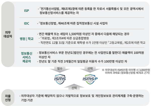 ISMS 인증의 특징은 의무 인증 대상자가 있다는 것이다. ‘전기통신사업법 제2조 8호’에 따르면, 전기통신사업자와 전기통신사업자의 전기통신역무를 이용해 정보를 제공하거나 정보를 매개하는 자로서 의무대상자 기준에 하나라도 해당되면 인증을 받아야 한다.