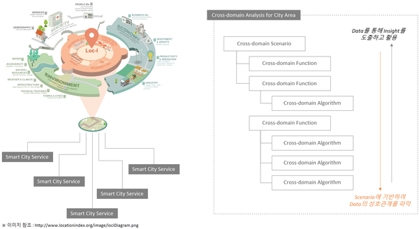 스마트시티 혁신성장동력 프로젝트에서 융복합 분석(Cross-domain Analysis)은 도시의 각 개별서비스의 결합에 용이하고 더 나아가 도시와 도시간의 결합이 가능한 구조로 설계하는 것에 주안점을 두었다. 총 3단계 구조인 시나리오(Scenario), 기능(Function), 알고리즘(Algorithm)의 계층구조 형태를 가지고 있다. 하나의 시나리오에는 여러 개의 기능이 존재하고 이 기능들의 리스트는 독립적으로 관리되어 다른 시나리오에 활용이 가능한 체계이다. 더 세부적으로 들어가 알고리즘은 기능의 최소 단위 프로그램이며 다른 기능에도 언제든지 가져다 사용할 수 있다는 점에서 재활용성을 높이는 모듈화된 컨셉으로 설계되었다.