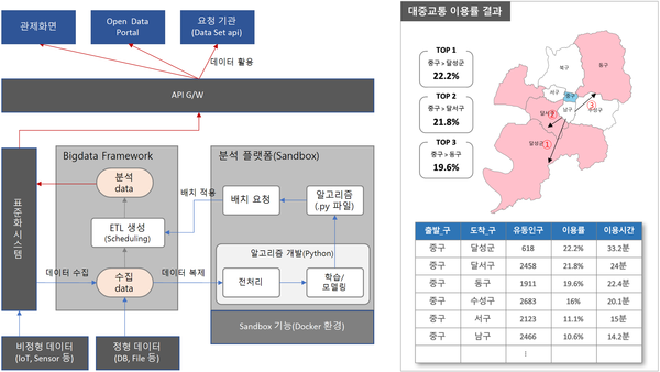 필자가 소속된 비투엔은 스마트시티 사업에서 도시 레거시(City Legacy) 데이터 수집, 데이터허브 구축, 융복합 분석 영역을 담당한다. 그 중에서도 안전 2.0 데이터 분석, 버스노선 최적화 등 융복합 분석 과제를 통해 대구시 도시문제 해결을 위한 다양한 알고리즘을 기획하고 분석하는 업무를 수행하고 있다. 또한 대구시 융복합 분석 사례를 표준 모델로 설계하여 다른 스마트 도시에 레퍼런스 할 수 있도록 고도화함으로써 융복합 분석 기법의 확산을 목표로 한다.