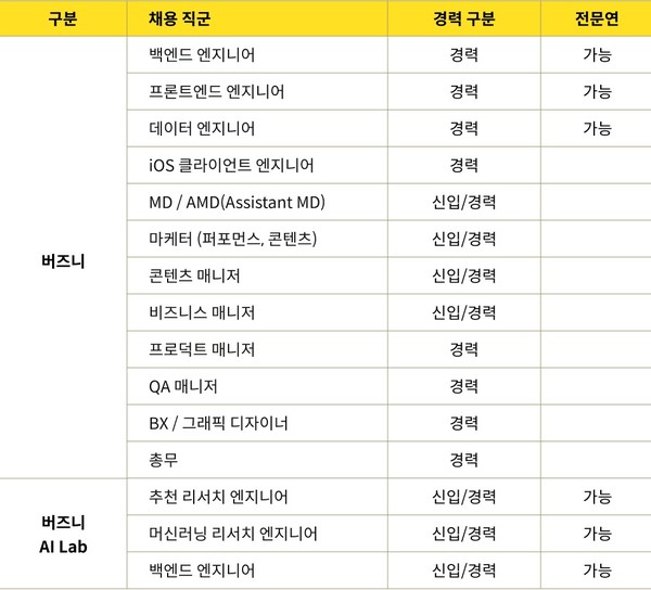 모집 부문은 ▲프론트엔드 엔지니어 ▲백엔드 엔지니어 ▲iOS 클라이언트 엔지니어 ▲데이터 엔지니어 ▲프로덕트 매니저 ▲MD/AMD ▲마케터 ▲콘텐츠 담당자 ▲QA 매니저 등이다. 커머스 AI 기술연구 조직인 버즈니AI랩에서는 ▲추천 리서치 엔지니어 ▲백엔드 엔지니어 ▲머신러닝 리서치 엔지니어 등을 채용한다. 채용 규모는 약 40명이며, 모집 기간은 채용 시까지다.