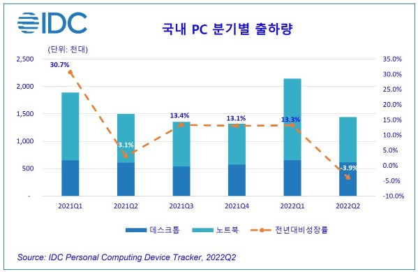 [아이티데일리] IT 시장분석 및 컨설팅 기관 한국IDC(대표 한은선)는 최근 발표한 국내 PC 시장 연구 분석에서 2022년 2분기 국내 PC 시장이 전년 대비 3.9% 감소한 144만 대 출하에 그쳤다고 17일 밝혔다.