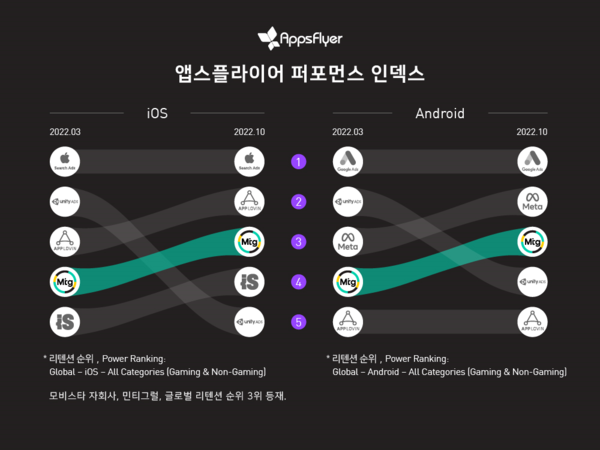 민티그럴은 리텐션 인덱스에서도 지속적으로 상위 글로벌 광고 네크워크로서 성장세를 유지하고 있으며 특히 이번 인덱스에서 안드로이드와 iOS 모두 톱3로 순위가 올라갔다.