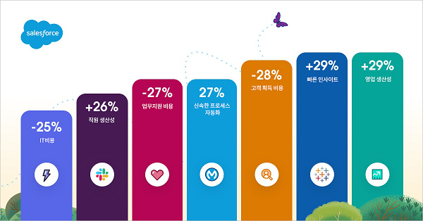 [아이티데일리] 경제성장률 둔화 전망에 따라 전 세계 기업들이 비용 절감 및 생산성 향상을 위한 투자를 지속하고 있는 현 상황에서 고객관계관리 및 임직원 경험 향상에 세일즈포스 솔루션이 기여하고 있다는 조사 결과가 나왔다. 세일즈포스를 도입한 기업은 도입 전과 비교해 평균적으로 IT 비용과 업무지원 비용 및 고객 획득 비용을 각 25%, 27%, 28% 절감한 반면, 직원 생산성과 영업 생산성은 각 26%, 29% 향상됐다고 응답했다.