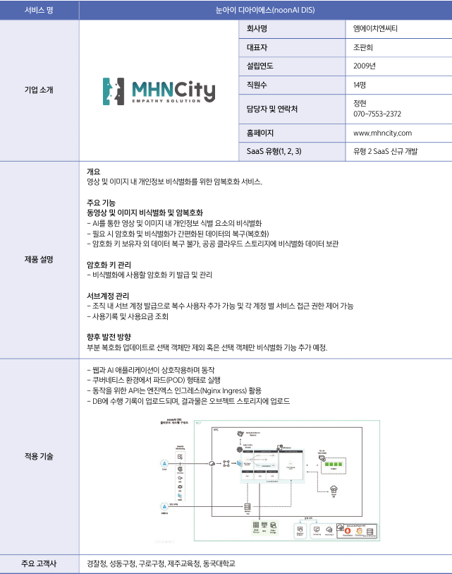 엠에이치엔씨티는 2022년 NIA의 ‘공공부문 이용 SaaS 개발‧검증 사업’의 유형 2, SaaS 신규개발 부문으로 참여해 ‘눈아이(noonAI DIS)’를 개발했다. 눈아이 DIS는 영상 및 이미지 내 개인정보 비식별화를 위한 암‧복호화 서비스다.