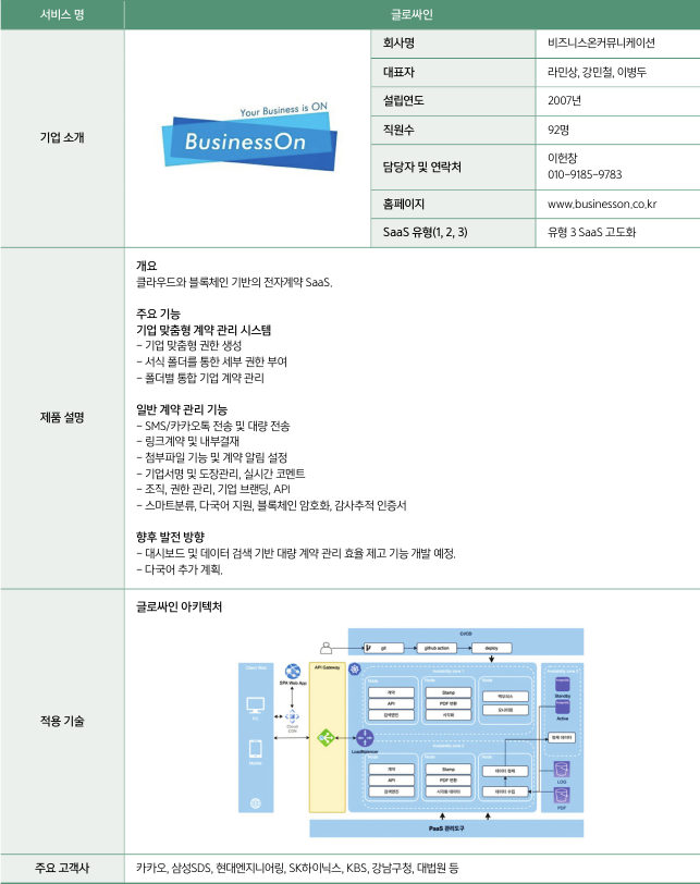 비즈니스온커뮤니케이션은 초기 일반 기업 대상 비즈니스를 위해 아마존웹서비스(AWS) 클라우드 기반의 글로싸인 SaaS를 제공했다. 하지만 공공기관 고객을 확보하기에는 법‧제도적 어려움이 있었고, 2022년 NIA의 ‘공공부문 SaaS 개발 이용‧검증’ 사업을 통해 공공고객 확보에 나섰다. 비즈니스온커뮤니케이션은 유형 3으로 신청했고, 기존 SaaS에 복수 기능을 추가하고 클라우드 네이티브화했다. 회사는 클라우드 공급기업으로 네이버클라우드-디딤 365 컨소시엄을 선택했고, 네이버클라우드 쿠버네티스 서비스를 활용해 SaaS를 고도화했다.