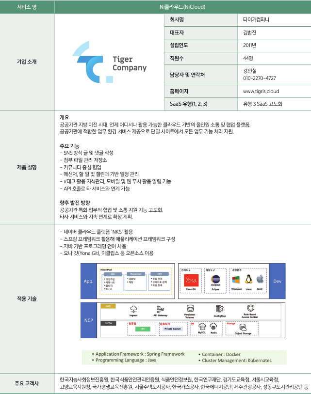 Ni클라우드는 한국IoT융합사업협동조합이 타이거컴퍼니에 위탁한 플랫폼으로 한글과컴퓨터(웹 오피스), 케이에듀텍(영상회의), 클라우드림(드라이브 저장소, 타이거컴퍼니 인수) 등 기업의 SaaS가 담겨있다. 타이거컴퍼니는 Ni클라우드로 NIA의 ‘공공부문 SaaS 이용 개발‧검증’ 사업의 유형 3에 참여했고, SaaS 고도화를 진행했다.