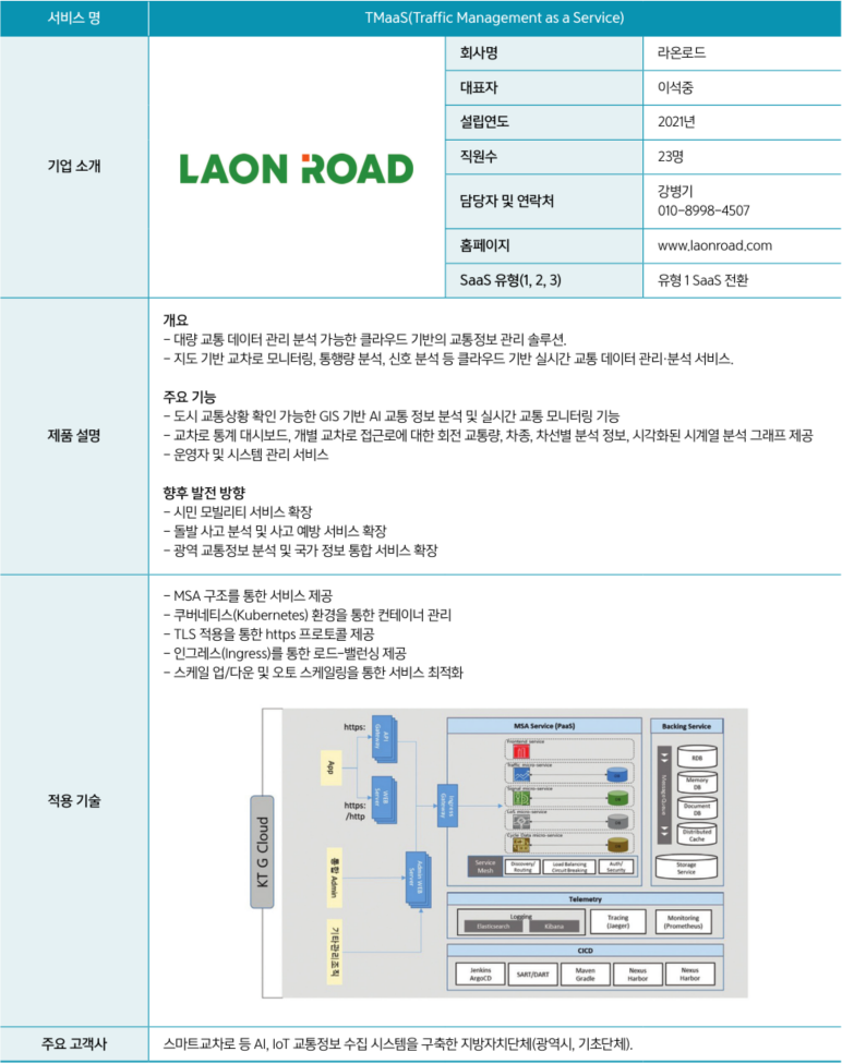 [아이티데일리] 라온로드(대표 이석중)는 2021년 설립된 스마트 교통 솔루션 전문기업이다. AI 영상 분석기술을 기반으로 AI를 탑재한 교통 영상 카메라를 개발했다. 경기도 안양시 인덕원 사거리에서 국내 최초로 AI 실시간 신호제어 교차로를 시범 운영한 바 있다. 라온로드는 사람과 모빌리티가 만나는 모든 도로에 안전하고 편리한 시스템을 구축하는 것을 목표로 비즈니스를 영위하고 있다. 라온로드는 ‘공공부문 SaaS 이용 개발‧검증’ 사업에서 유형 1로 신청했다. 라온로드가 이번 사업으로 전환한 SaaS의 명칭은 ‘TMaaS’로, 지자체 스마트 교통정보 관리 서비스다.