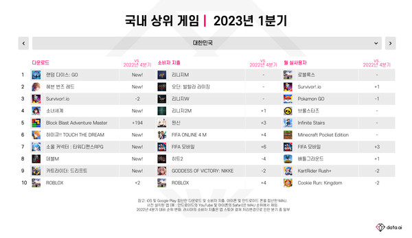 9일 데이터 및 분석 플랫폼 데이터닷에이아이(data.ai, 구 앱애니)는 이 같은 내용을 담은 ‘2023년 1분기 모바일 게임 결산’을 발표했다.