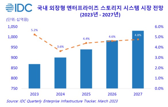 IT 시장분석 및 컨설팅 기관인 한국IDC(대표 한은선)는 최근 발간한 ‘국내 외장형 엔터프라이즈 스토리지 시스템 시장 전망(2023~2027) 보고서’를 인용해 이 같이 밝혔다.