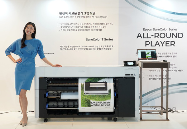 한편 엡손은 이번 신제품 발표회에서 도면, 포스터, 현수막 등 다채로운 출력물 구현이 가능한 엡손 슈어컬러(SureColor) SC시리즈 7종도 공개했다. 이번 SC-T7740D는 프린트 헤드 면적이 기존 동급의 2.54cm에서 6.71cm로 늘어나 인쇄 품질이 향상되고 1.7~3.6배까지 출력 속도가 빨라져 생산성을 향상시켰다. 또한 엡손의 신기술로 개발된 안료잉크 시스템과 마이크로TFP(MicroTFP) 프린트 헤드의 조합으로 6색 구성이면서도 기존 9색 모델 대비 약 90%의 색상 재현력을 보여준다. SC-P 시리즈(BK/MK/C/M/Y/Grey 잉크 구성)는 고품질의 포스터 및 GIS, 지도 등에 사용되며, SC-T 시리즈(BK/MK/C/M/Y/RED 잉크 구성)는 원색 표현이 필요한 POP, 포스터, 캐드(CAD), 건설조감도 출력에 적합하다.