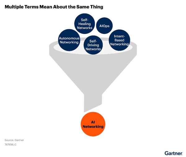 AI 네트워킹과 관련된 다른 용어로는 자율 네트워킹, 자율 주행 네트워크, 자가 치유 네트워크 등이 있다. 이러한 용어들은 구체적인 정의가 없는 마케팅 용어로, 보통 AI 네트워킹을 설명하기 위해 사용되며(그림1 참조), 데이터센터 스위칭과 유무선 랜(LAN), 소프트웨어-정의 광역통신망(SD-WAN), 관리형 네트워크 서비스(MNS) 및 멀티클라우드 네트워킹 소프트웨어와 같은 네트워킹 도메인 전반에 적용된다. 일부 기능은 특정 도메인에서 다른 도메인보다 더 성숙한 수준을 보이지만, 데이터 수집 노력, 데이터 레이크 저장, 알고리즘, 데이터 사이언스, 그리고 네트워크 문제에 대한 자동화된 대응은 모든 영역에서 중요하다.