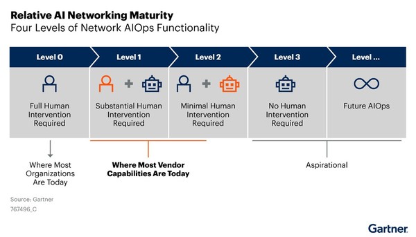 대부분의 공급업체는 솔루션에 인간의 개입이 일부 및 최소한으로 필요한 레벨 1, 2 수준의 기능을 보유하고 있다(그림 2참조). 그러나 많은 기업들은 인간의 개입이 절대적으로 필요한 레벨 0에 머무르며 실제로 오늘날 네트워크 작업의 약 65%가 수작업으로 이루어지는 것으로 파악된다. 공급업체들의 역량이 아직 초기 단계일지라도 최종 조직의 기술 활용 능력보다는 높다는 것을 알 수 있다.