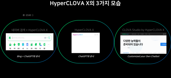 구체적으로 공개할 순 없지만 크게 △클로바X △큐:(Cue:) △하이퍼클로바X 기반 클로바스튜디오 등 3가지 서비스로 출시될 예정이다. 먼저 대화형 에이전트 ‘클로바X’는 입력된 질문에 답변하는 서비스다. 글을 쓰고 요약할 수 있어 개인 생산성 도구로 이용할 수 있다. 다양한 서비스를 플러그인 형태로 연동해 필요한 기능도 호출할 수 있다.