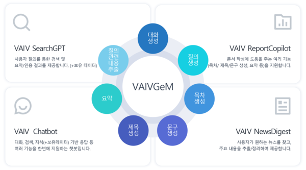 A. 솔루션은 △바이브 서치GPT(VAIV SearchGPT) △바이브 리포트코파일럿(VAIV ReportCopilot) △바이브 챗봇(VAIV Chatbot) △바이브 뉴스다이제스트(VAIV NewsDigest) 등 총 4가지다. 바이브 서치GPT는 기업이 보유한 문서를 검색하고 바이브 젬을 통해 핵심 내용에 대한 요약 결과를 제공하는 서비스다. 참조한 문서를 함께 근거로 제시해 요약 결과에 대한 2차 검증이 가능하다.