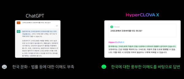 하이퍼클로바X의 한국어 성능은 GPT-3.5의 영어 답변 성능 이상이다. 특히 사용자가 질문을 하면 답변을 하는 속도가 챗GPT보다 훨씬 빠르며, GPT-3.5보다 한국어 데이터를 6,500배 더 많이 학습했다.