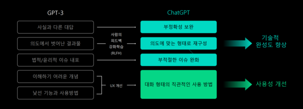 마지막으로 강화학습에 기반한 LLM이라는 점이다. 사용자의 의도에 맞는 답변을 생성하기 위한 ‘인스트럭션-팔로잉(Instruction-Following)’ 모델을 갖추고 있다. 생성한 답변에 대한 사람의 피드백 점수를 ‘리워드 모델’로 학습시켰으며, 사용자 만족도 점수가 높은 출력을 생성하도록 정책 모델을 최적화했다.