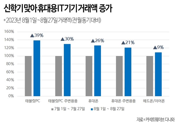 다나와에 따르면 이달 1일부터 27일까지 IT 기기의 거래액을 비교한 결과 전월 같은 기간 대비해 태블릿PC 39%, 휴대폰은 26% 상승했다.