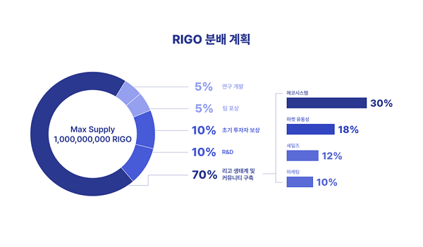재단 측은 총 유통량의 70%인 7억 개를 에코시스템(30%), 마켓 유동성(18%), 세일즈(12%) 마케팅(10%)에 배정해 리고 코인의 생태계와 커뮤니티 구축에 활용하고, 남은 30%는 R&D 연구개발(15%), 초기 투자자 보상(10%), 팀 포상(5%) 등에 투자한다는 계획이다.
