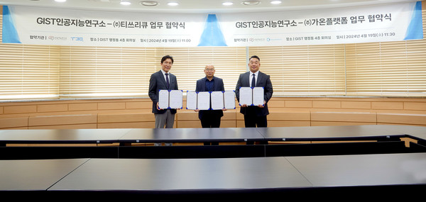 [아이티데일리] 광주과학기술원(총장 임기철, 이하 GIST)은 인공지능연구소(소장 안창욱)가 티쓰리큐(대표 박병훈), 가온플랫폼(대표 조만영)과 ‘스마트 산업 실현을 위한 인공지능(AI) 및 빅데이터 관련 통합 플랫폼’의 공동 연구 개발을 목적으로 MOU를 체결했다고 밝혔다.