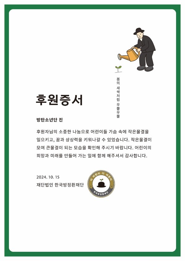 이번 기부는 10월 독서의 계절 가을을 맞아 준비됐다. BTS(지민, 슈가, 진, 정국), 엔하이픈 희승, 세븐틴 정한, 플레이브(예준, 밤비, 은호), 르세라핌 허윤진, 유니스(엘리시아, 코토코), 트와이스 다현 총 12명의 이름으로 한국방정환재단 내 ‘작은물결문고’ 프로젝트를 통해 어린이용 도서가 기부됐다.