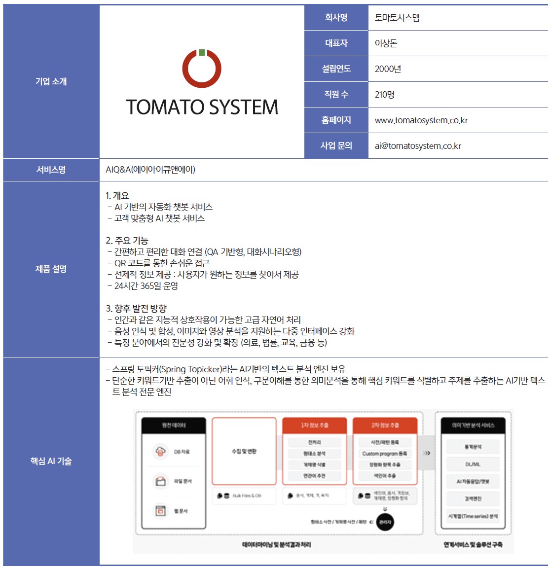 토마토시스템은 현재 AI 기술을 접목시킨 챗봇서비스 ‘AIQ&A’를 제공하고 있다. 이 서비스의 가장 큰 특징은 ‘누구나 쉽고 부담 없이, 자신만의 서비스를 할 수 있다는 것’이다. 소규모 사업장에서도 쉽게 도입이 가능해 사찰, 성당, 교회 같은 종교 단체를 비롯 뷰티 산업군(미용실, 네일샵 등) 및 동네 의원이나 치과 같은 작은 병원, 카페나 식당 등 우리 주변의 다양한 업종도 대응이 가능하다. 이런 특성을 반영해 공급처 확산 방안을 마련하고 추진 중에 있다.