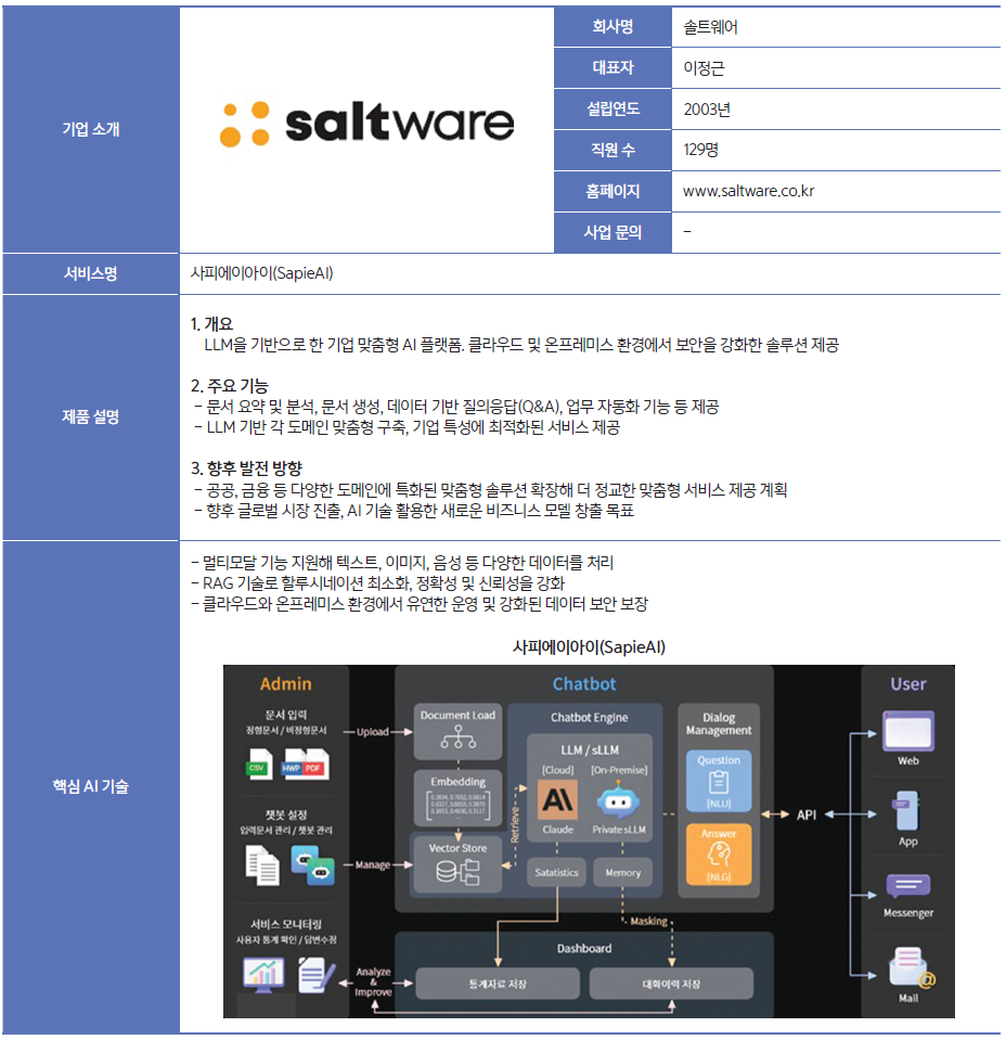 사피에이아이는 솔트웨어가 자체 개발한 LLM 기반 기업용 AI 챗봇 솔루션이다. 사피에이아이는 문서 요약과 데이터 분석, 그리고 내부지식 기반 질의응답 등 고객과 산업별 도메인에 맞춰 최적화된 서비스를 제공한다. 개발은 아마존 베드록 플랫폼 내 앤스로픽의 ‘클로드 3.5 소넷’을 기반으로 수행했다. 또한 사피에이아이는 클라우드용과 온프레미스용으로 구분해 고객이 어떤 유형을 사용할지 선택할 수 있게 제공하고 있다.