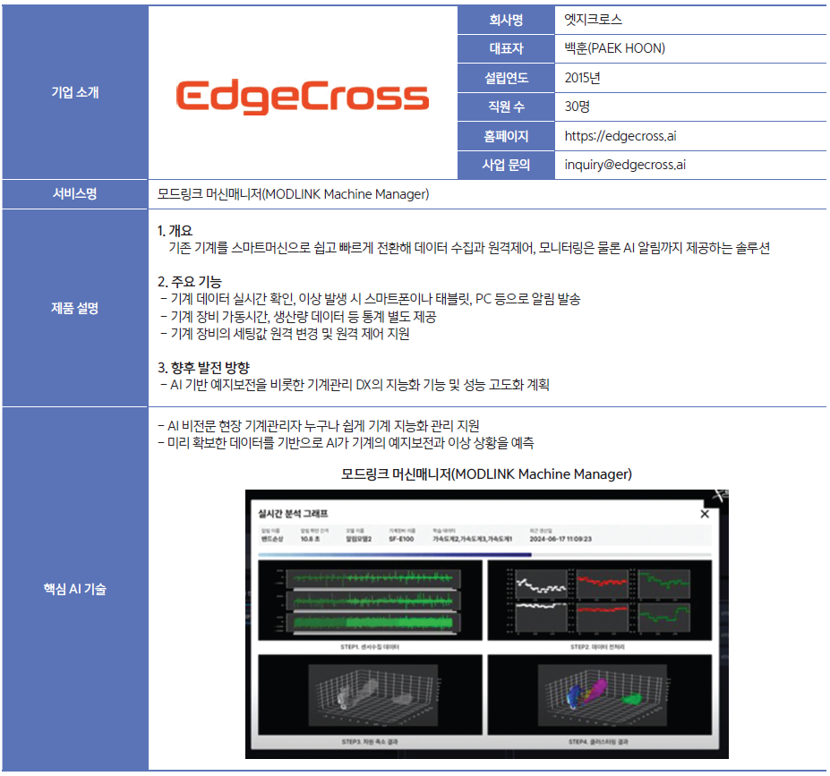 엣지크로스는 일반 기계 및 장비의 스마트화를 위해 자체 개발한 AI 스마트머신 토털 솔루션을 제공하고 있는 국내 스타트업이다. SaaS 기반 구독 모델을 바탕으로 지속 가능한 매출 구조를 확보하고, 자체 개발한 AIoT 장비 판매 및 저비용 고성능의 솔루션을 제공해 오며 사업을 확장해 왔다. 현재 엣지크로스 AIoT 디바이스는 8,000대 이상의 기계들과 연동돼 있으며, 매일 3.2GB 상당의 기계 데이터를 와이파이나 LTE 등 무선통신을 통해 클라우드로 수집 및 분석하고 있다.