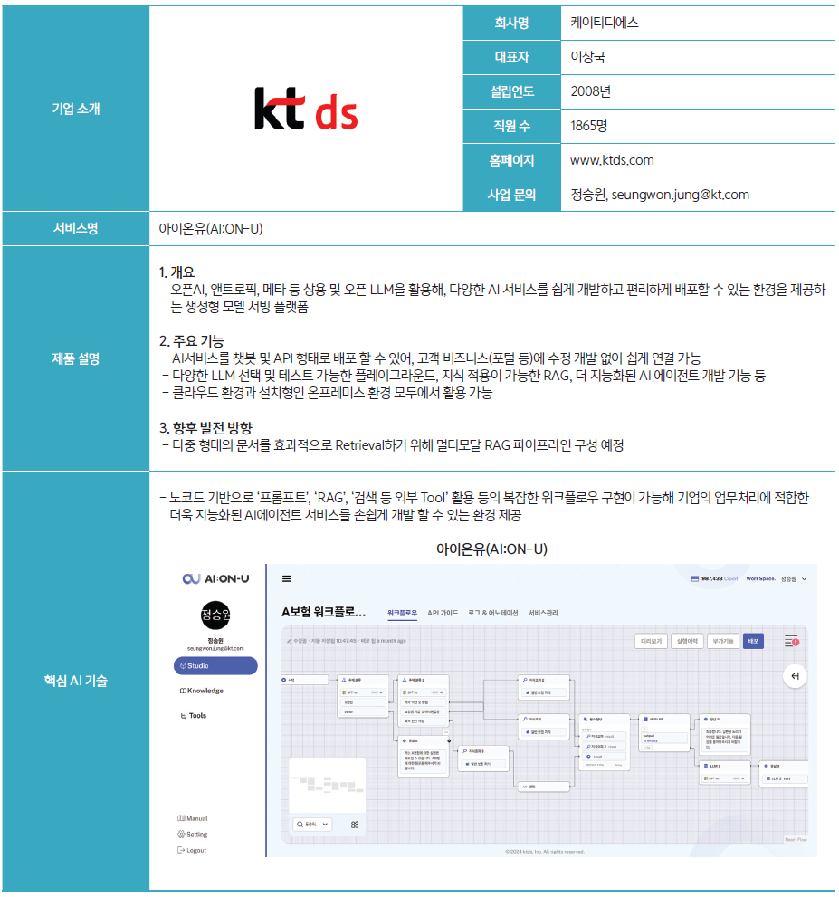 KT DS는 앤트봇, 에이아이센트로, 아이온유 등 AI 솔루션을 비즈니스 전면에 배치했다. 생성형 AI 서비스를 기업이 쉽게 도입할 수 있도록 지원하는 생성형 AI 모델 서빙플랫폼인 아이온유는 상용부터 오픈소스까지 다양한 LLM을 지원한다. 특히 노코드 기반으로 손쉽게 AI 서비스를 개발할 수 있는 스튜디어 기능을 통해 서비스를 직관적으로 개발, 테스트하고 배포할 수 있는 기능도 갖췄다.