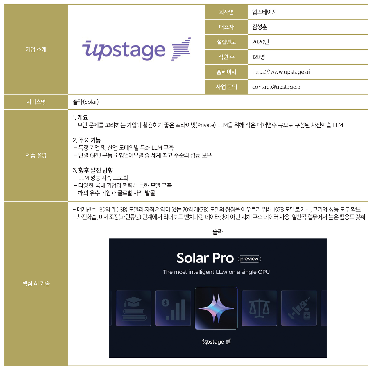 업스테이지(대표 김성훈)는 2020년 설립된 국내 대표 AI 스타트업이다. 생성형 AI 시대를 맞아 국내외 기업들이 AI로 혁신을 일굴 수 있도록 자체 기술력과 제품군을 강화하고 있다.
