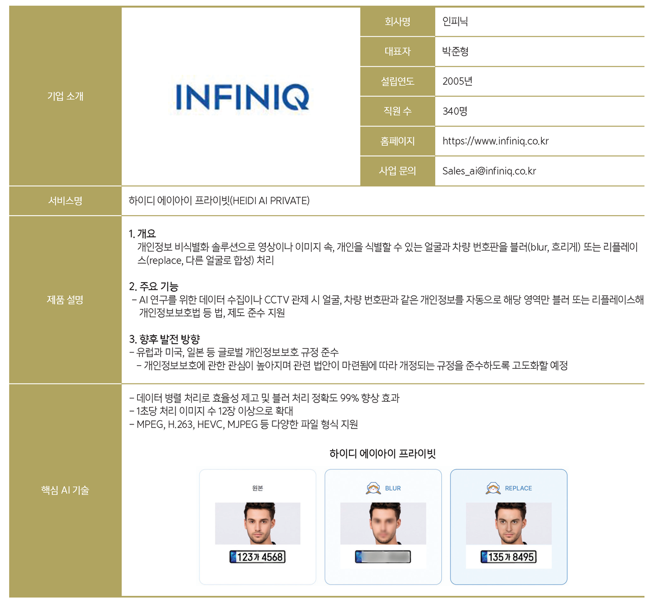 인피닉의 주요 서비스는 통합 모니터링 솔루션인 ‘하이디 에이아이(HEIDI-AI)’다. 하이디-에이아이는 △개인정보 비식별화 솔루션 ‘프라이빗(Private)’ △AI 기반 영상 검색 솔루션 ‘맥스(Max)’ △AI 기반 통합 관제 모니터링 솔루션 ‘가드(Guard)’로 구성된다.