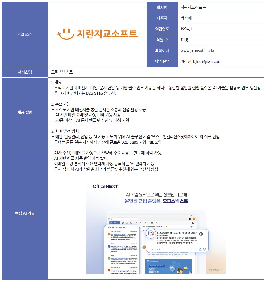 올해 지란지교소프트는 올인원 협업 플랫폼인 ‘오피스넥스트’를 선보이며 B2B SaaS 기업으로의 새로운 도약을 알렸다. 오피스넥스트는 조직도 기반의 메신저, 메일, 문서 협업 등 기업에 필수적인 업무 기능을 연결해 하나의 서비스로 제공하는 협업 플랫폼이다. 특히 AI 기술을 활용해 메일 확인 및 문서 작성 등 단순 반복되는 업무에서 발생하는 불편을 최소화하고, 업무 생산성을 크게 향상시킨다.