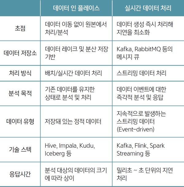 데이터 인 플레이스 분석 방식은 기본적으로 정형, 비정형 데이터의 분석 환경을 분리하지 않고 단일 스토리지 환경에서 데이터를 수집하고 수집한 상태 그대로 통합 분석한다.