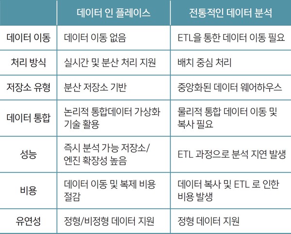 전통적인 데이터 분석 방식과 데이터 인 플레이스의 가장 큰 차이점은 ‘데이터 추출·변환·적재(ETL, Extract, Transform, Load) 과정을 생략한다는 점’과 ‘정형, 비정형 데이터 분석 환경을 분리하지 않는다는 점’이다.