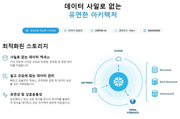 스노우플레이크가 전면에 내세운 플랫폼은 ‘AI 데이터 클라우드’다. 데이터 유형과 워크로드를 지원하는 동시에 모든 아키텍처 패턴을 활성화해 기업 내의 데이터 사일로를 제거한다. 특히 다양한 형식, 구조 및 저장 위치의 데이터를 처리하고 협업하기 위한 단일 플랫폼으로, 개방형 표준을 수용하기 위해 아파치 아이스버그 지원 및 오픈소스 카탈로그인 ‘폴라리스 카탈로그(Polaris Catalog)’도 갖추고 있다.