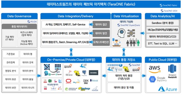 데이터스트림즈는 ‘테라원(TeraONE)’이라는 통합 플랫폼을 통해 데이터 패브릭에 필요한 세부 솔루션을 제공하고 있다. 테라원은 빅데이터 수집·가공·저장부터 데이터 거버넌스, 데이터 가상화, AI 분석, 빅데이터 관리 기능을 통합해 제공한다. 크게 데이터 레이크를 지원하는 ‘스탠더드’ 버전, 수집부터 시각화까지 데이터 분석의 전 과정을 지원하는 ‘프로페셔널’ 버전, 데이터 거버넌스 기반 데이터 가상화를 지원하는 ‘패브릭’ 버전 등 3가지로 구성돼있다.