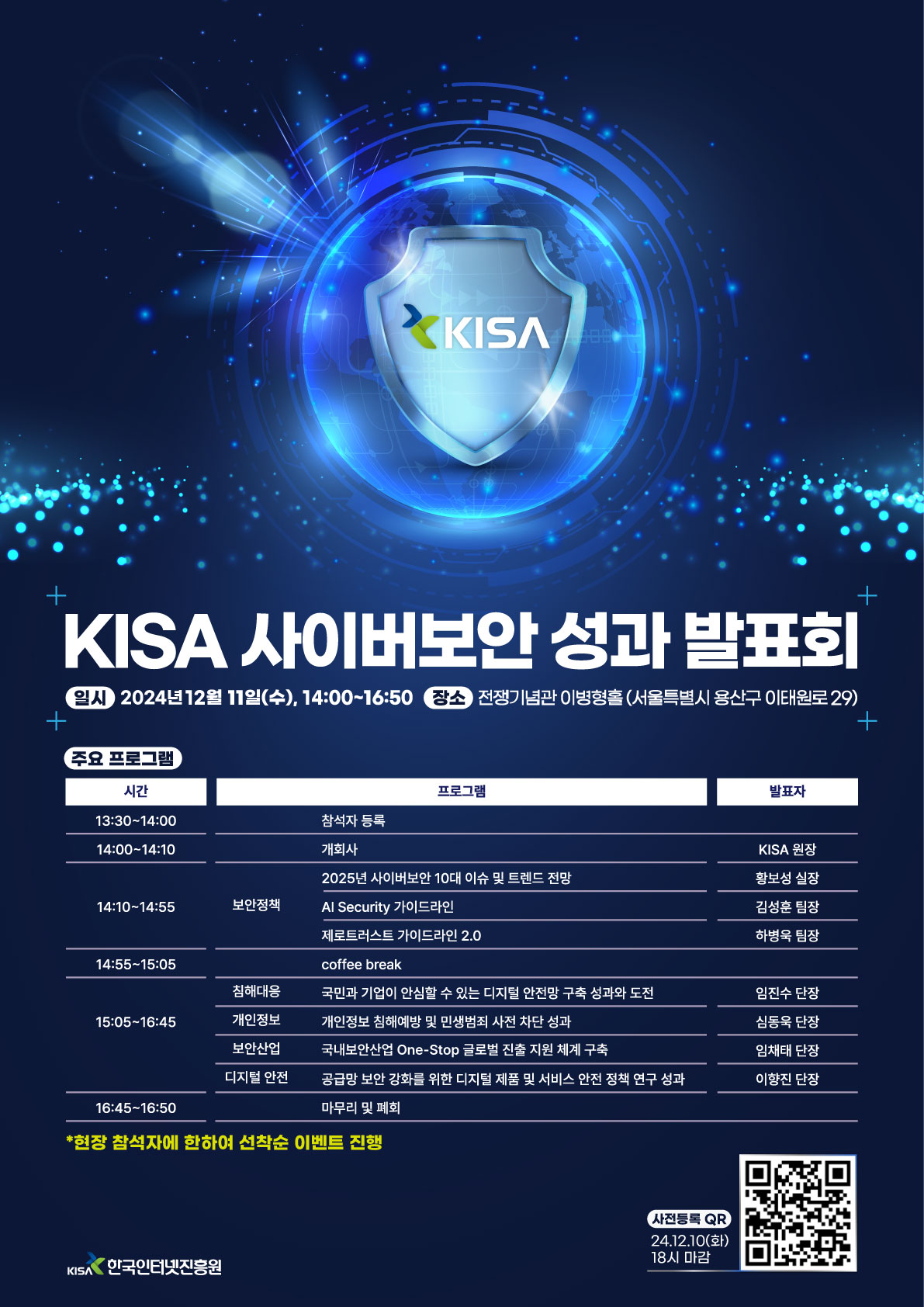 KISA 이상중 원장은 “인공지능, 양자기술 등으로 삶이 편리해지고 있지만 동시에 사이버 위협이 지능화, 고도화되어 일상의 안전과 안보를 위협받고 있다”며 “이번 성과 발표회를 통해 안전한 사이버공간 실현을 위한 현장의 목소리가 보안 대응 전략 수립에 반영될 수 있도록 노력하겠다”고 말했다.