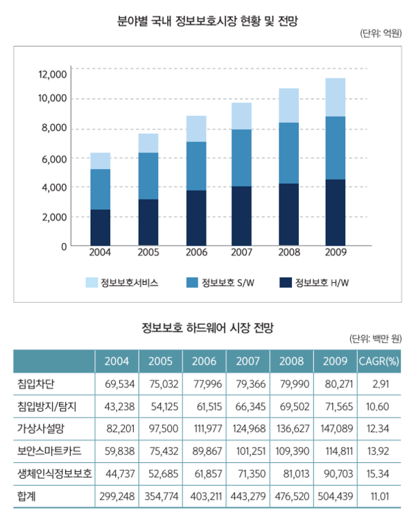 2009년을 기준으로 가장 큰 매출을 보일 분야는 가상 사설망으로 예상 규모는 1,471억 원이며, 가장 크게 성장할 것으로 예상되는 분야는 생체인식정보보호 및 보안스마트카드 분야다. 이 중 침입차단 하드웨어의 경우, 시장이 성숙기 중반에 접어들고 있을 뿐 아니라 가상사설망 등 다른 제품과의 통합이 급진전되면서 그 성장세가 현저히 둔화될 것으로 보인다. 시장 규모는 지난해 695억 원에서 2005년 750억 원, 2009년에는 803억 원으로 전망된다.