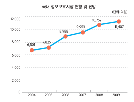 2005년 정보보호시장은 2004년 대비 20.3% 늘어난 7,825억 원 규모로 전망된다. 또한 2009년까지 연평균 11.9% 성장해 2008년에 1조 원을 돌파, 2009년 1조 1,407억 원 규모를 형성할 것으로 예상된다.