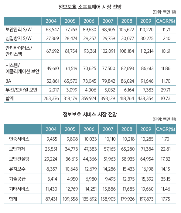 성장률이 가장 높은 분야는 정보보호 서비스 분야로 연평균 17.8%의 성장을 거듭해 2009년에는 규모가 1,979억 원에 이를 것으로 추정된다. 정보보호 하드웨어 및 소프트웨어 분야는 2009년 시장 규모가 각각 5,044억 원 및 4,384억 원으로, 연평균 성장률은 11.0%와 10.7%로 조사됐다. 2009년까지 하드웨어 분야의 성장률이 소프트웨어 분야의 성장률보다 다소 높을 전망이다.