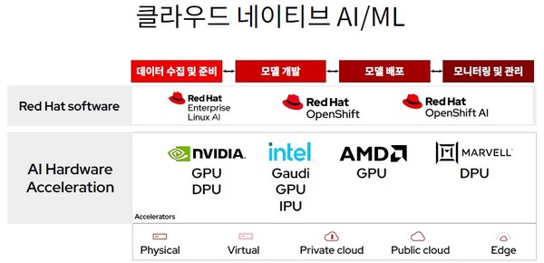 레드햇 역시 ‘레드햇 엔터프라이즈 리눅스 AI(RedHat Enterprise Linux AI)’와 ‘레드햇 오픈시프트 AI(RedHat Openshift AI)’로 구성된 ‘레드햇 AI 플랫폼(RedHat AI Platform)’을 기반으로 클라우드 네이티브 환경에서의 AI 확장 및 배포를 지원하고 있다.