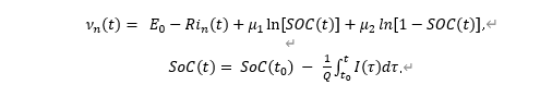 아래의 수식은 배터리의 충방전 과정에서 단자 전압과 충전 상태(SoC: State of Charge)의 변화 관계를 설명하는 네른스트(Nernst) 방정식과 충전 상태의 시간에 따른 쿨롱 계수(Coulomb Counting)를 설명하고 있다. 초기 전압이 저항(R)과 충전 상태에 따라서 얼마나 감쇠하는지를 설명하는 방정식이며, 적절한 난수와 파라미터의 설정을 통해 수만 개의 가상의 배터리 충전 상태의 열화(degradation)현상을 시뮬레이션할 수 있다(그림 4의 왼쪽 참고).
