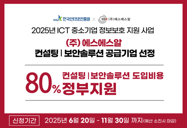 [아이티데일리] 정보보호 컨설팅 및 보안 솔루션 전문기업 에스에스알(대표 고필주)은 과학기술정보통신부와 한국인터넷진흥원(KISA)이 주관하는 ‘2025년 ICT 중소기업 정보보호 지원사업’에서 컨설팅과 보안솔루션(SECaaS) 공급기업으로 선정되어 수요기업을 모집하고 있다고 1일 밝혔다.