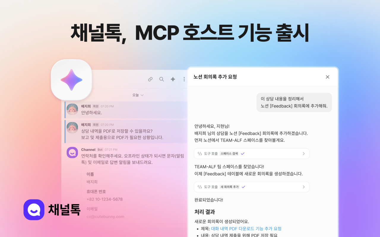 더불어 채널코퍼레이션 측은 바이브 코딩 환경에서 자연어 명령으로 비개발자도 쉽게 활용할 수 있는 MCP 서버 기능도 제공한다. 기존에는 채널톡 설치와 데이터 연동을 개발자가 직접 시스템과 매칭해야 했지만, 이번 업데이트로 비개발자도 “채널톡 설치해 줘”, “회원정보 연동해 줘”와 같은 자연어 명령만으로 간편하게 채널톡을 설치 및 연동을 완료할 수 있다는 설명이다.
