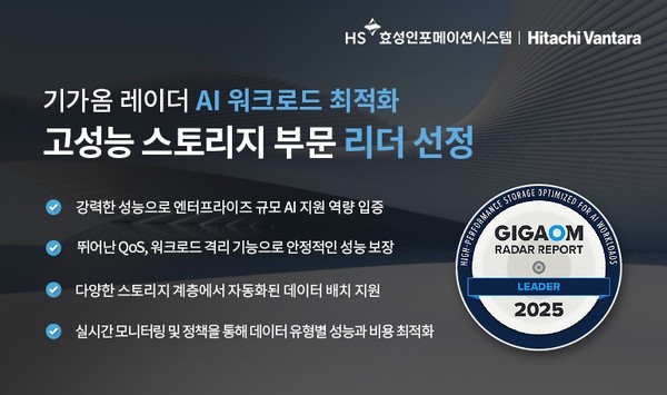 [아이티데일리] AI·데이터 인프라 솔루션 전문기업 HS효성인포메이션시스템(대표 양정규)은 시장 분석기관 기가옴(GigaOm)이 발표한 ‘AI 워크로드 최적화를 위한 고성능 스토리지’ 보고서를 인용, 히타치 밴타라(Hitachi Vantara)가 ‘리더 및 패스트 무버’로 선정됐다고 10일 밝혔다.